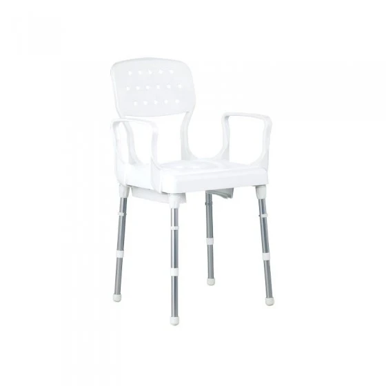 Cette chaise de douche Confort peut être réglée en hauteur. Elle est livrée avec des accoudoirs et un dossier. Elle est prévue pour vous accompagner sous la douche et peut aussi servir de fauteuil garde-robe grâce à son pot (en option).