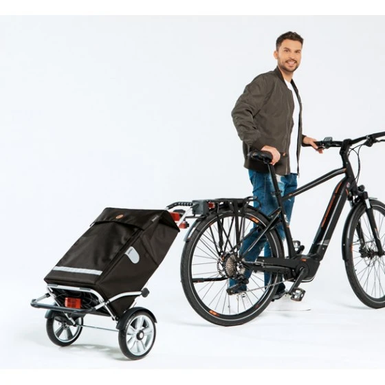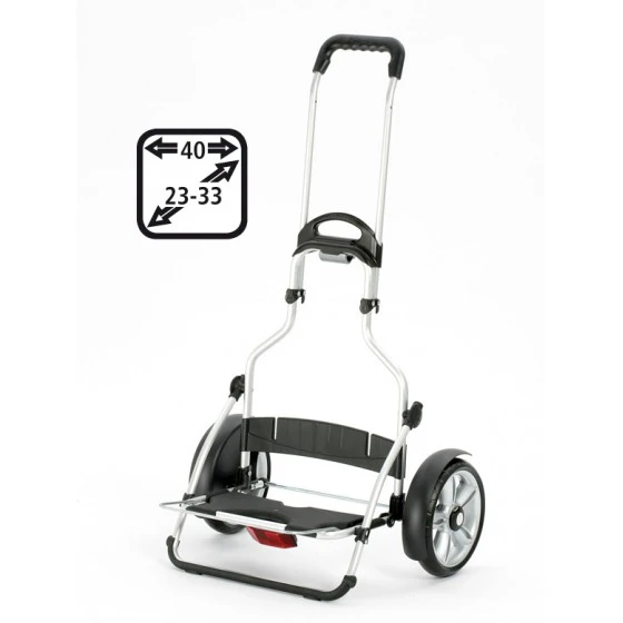 Poignée pliable / Piètement pliable / Arceau rabattable / Utilisable en remorque vélo / Chassis en aluminium / Roue à roulement à billes / Roues facilement amovibles / Roues à marche facile / Attache caddie / Compartiment Isotherme / Fonction sac à dos / Réflécteurs / Poche extérieure / Poche intérieure / Sac traité pour la pluie / Sac facilement amovible / Dimensions du sac :36cm x67cm x24cm, soit un volume de 62 Litres / Dimensions du chassis :108cm x58cm / Charge maximum chassis :50KG / Poids du chariot : 5KG / FABRIQUE EN ALLEMAGNE