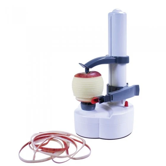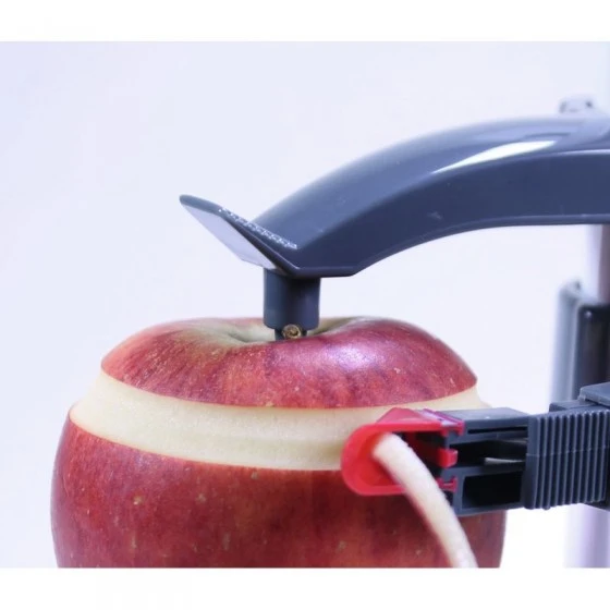 Cette machine pèle et épluche les fruits et légumes à votre place. Il suffit de fixer le fruit désiré sur le support à pointes, de descendre la pointe de maintien, et d’appuyer sur le bouton.