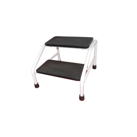 Marches à plateaux coins arrondis, noyau bois revêtu caoutchouc antidérapant. Structure acier époxy blanc.
