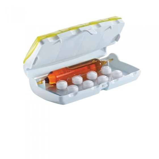 Ce pilulier journalier est doté de larges cases permettant de ranger différents types de médicaments (comprimés, gélules, ampoules, sachets..).