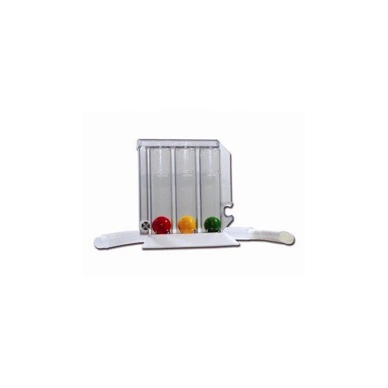 Dispositif d’entraînement à la respiration par l’inspiration. Rééducation après intervention. Usage personnel ou unique. Corps transparent avec 3 compartiments contenant une boule de couleur. Sur chaque compartiment est indiquée la valeur du volume inspiré, 600, 900 ou 1200 cc par seconde. Sans latex.