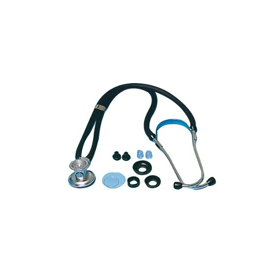 Stéthoscope modèle Rappaport livré avec 1 paire d’embouts souples, 1 paire d’embouts rigides et 2 membranes de rechange en coloris noir.