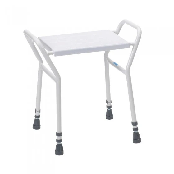 Le tabouret de douche avec accoudoirs Oasis est réglable en hauteur de 48 cm à 63 cm. Il est muni de deux grands accoudoirs très pratique pour de relever et s’asseoir. Sa largeur entre accoudoirs est de 52 cm, ce qui permet à des personnes fortes de l’utiliser. D’autant que la structure de l’ensemble est renforcée. Le poids admis est de 154kg.