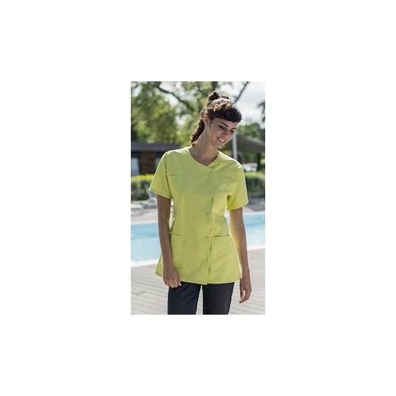 Encolure arrondie légèrement dégagée, fermeture latérale 5 pressions inox, manches courtes kimono, 3 poches. Haut. 75 cm.