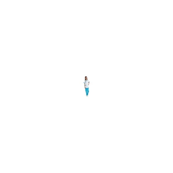 Encolure trapèze. Manches courtes kimono. 3 poches. Fermeture latérale parement turquoise/bleu sur encolure, manches et poches. Haut. 75 cm. Sergé uni blanc 65 % polyester 35 % coton. 210 g/m2. Livrée sans pantalon.
